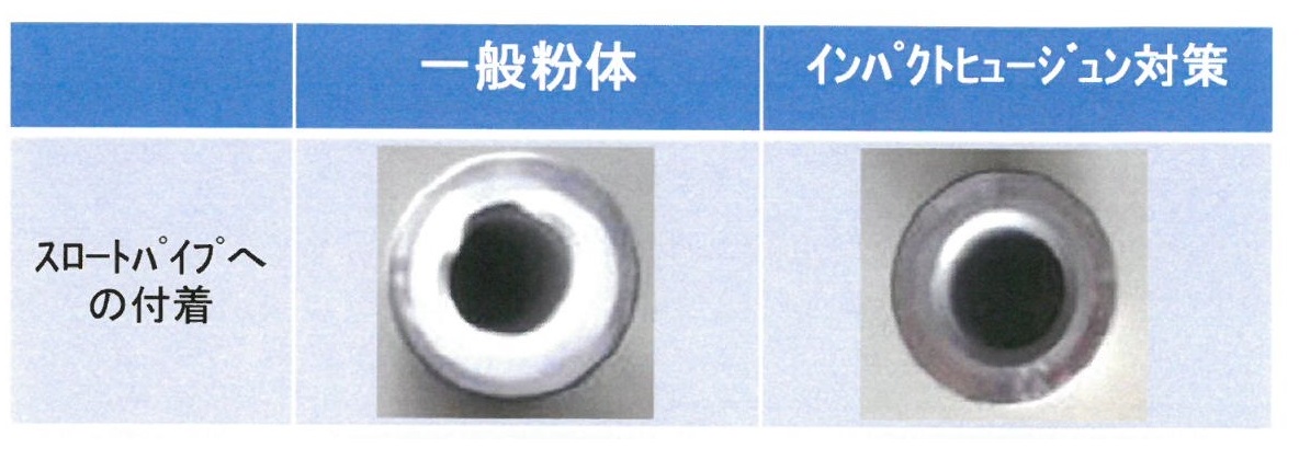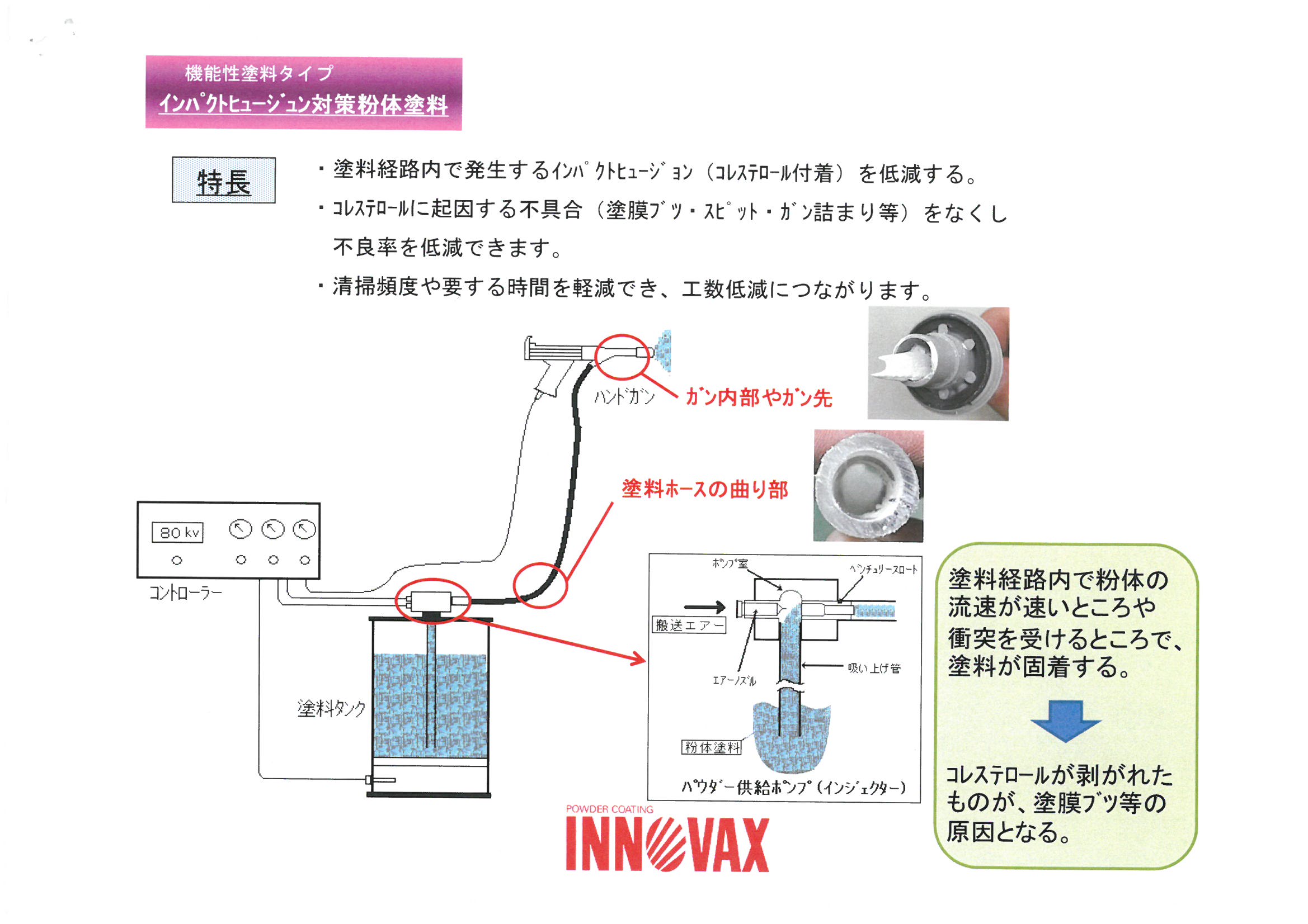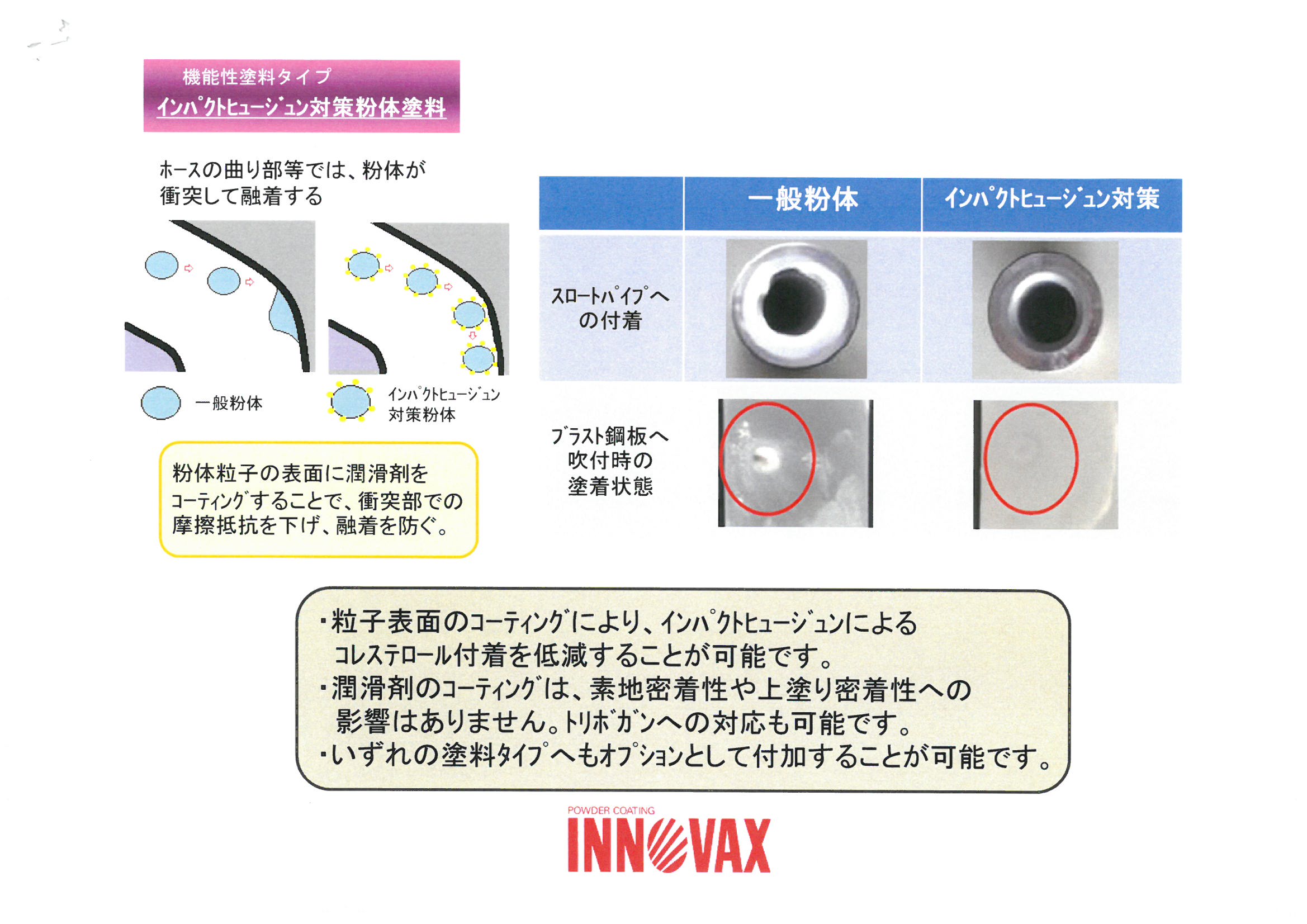 | 粉体塗料を塗装中、ガン詰りや塗膜ブツでお困りのことありませんか?インパクトヒュージン対策粉体塗料を用いれば、これらの症状が軽減できます。インパクトヒュージン対策粉体塗料は粉体粒子が従来のもとは異なり、粒子の表面に潤滑剤がコーティングされており、それによって摩擦抵抗を下げています。 |