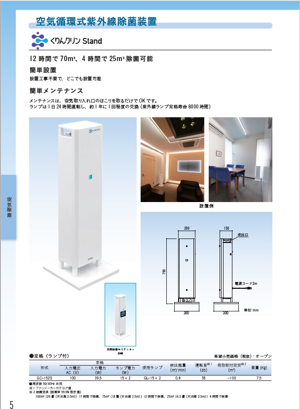 空気循環式 【くりんクリンStand】 ・床置きタイプ ・空気をファンで取り入れて、ウイルスや細菌などの浮 遊菌を紫外線ランプで殺菌し、クリーンな空気を排出 します。 ・設置工事不要で、どこでも設置可。