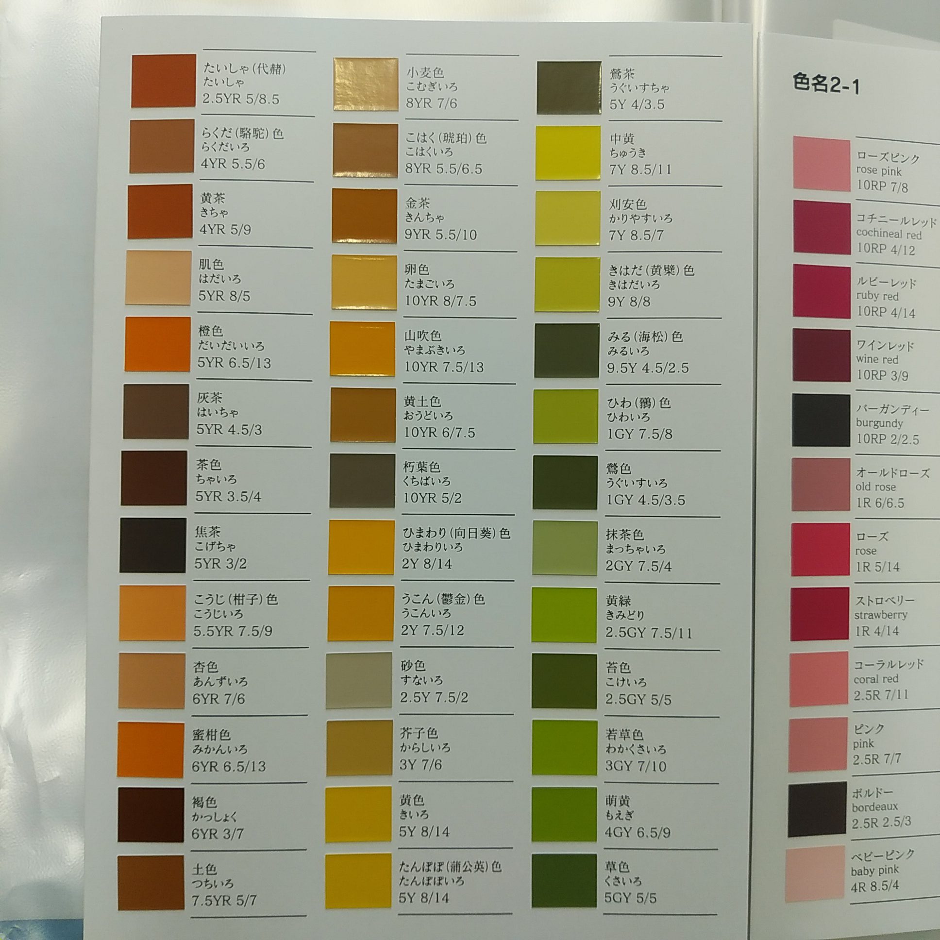 2001年に改正された日本工業規格(JIS Z 8102 物体色の色名)の中の慣用色名269色について、その色名と定められた基準値およびその色を、油性塗料による精密な色票を貼付してまとめたものです。