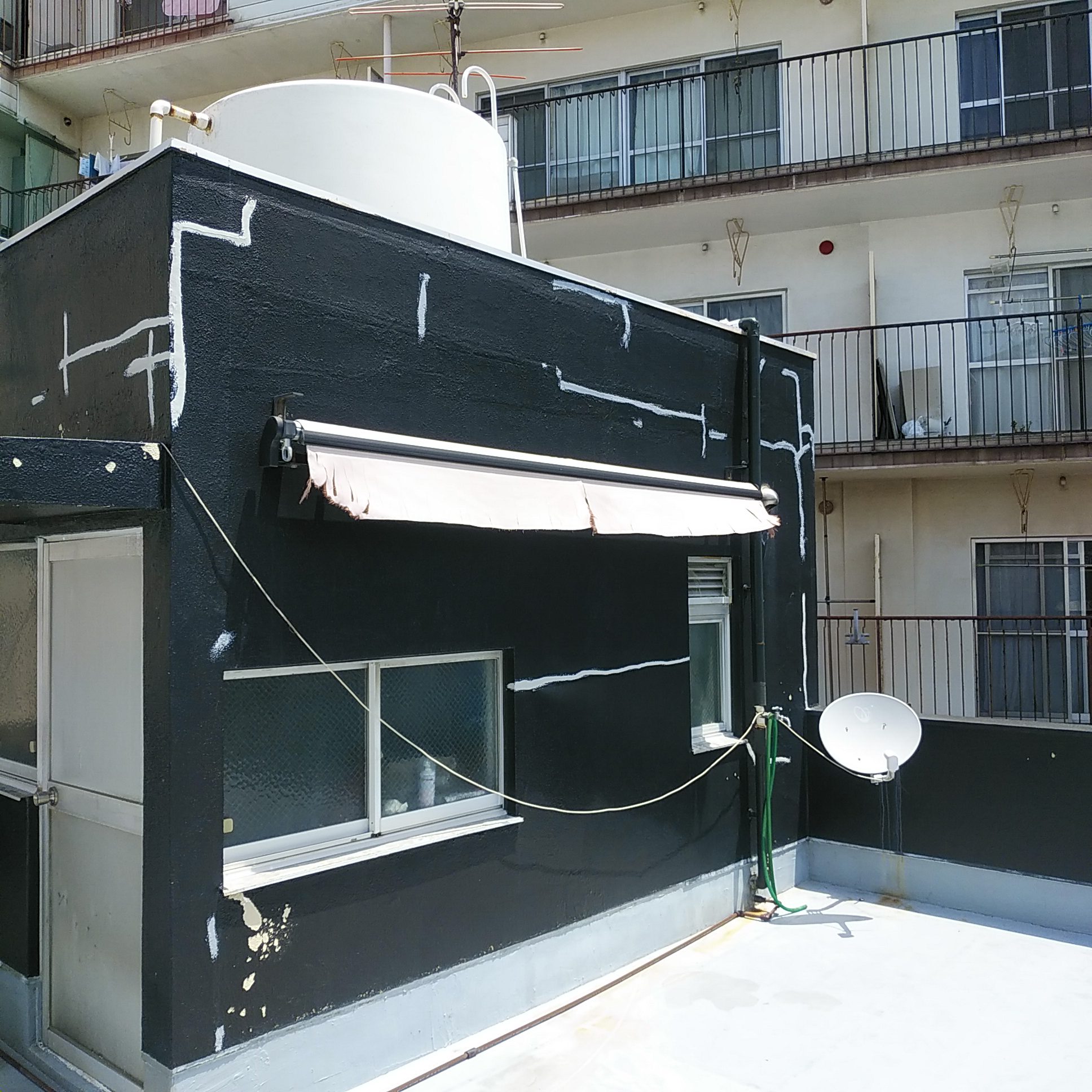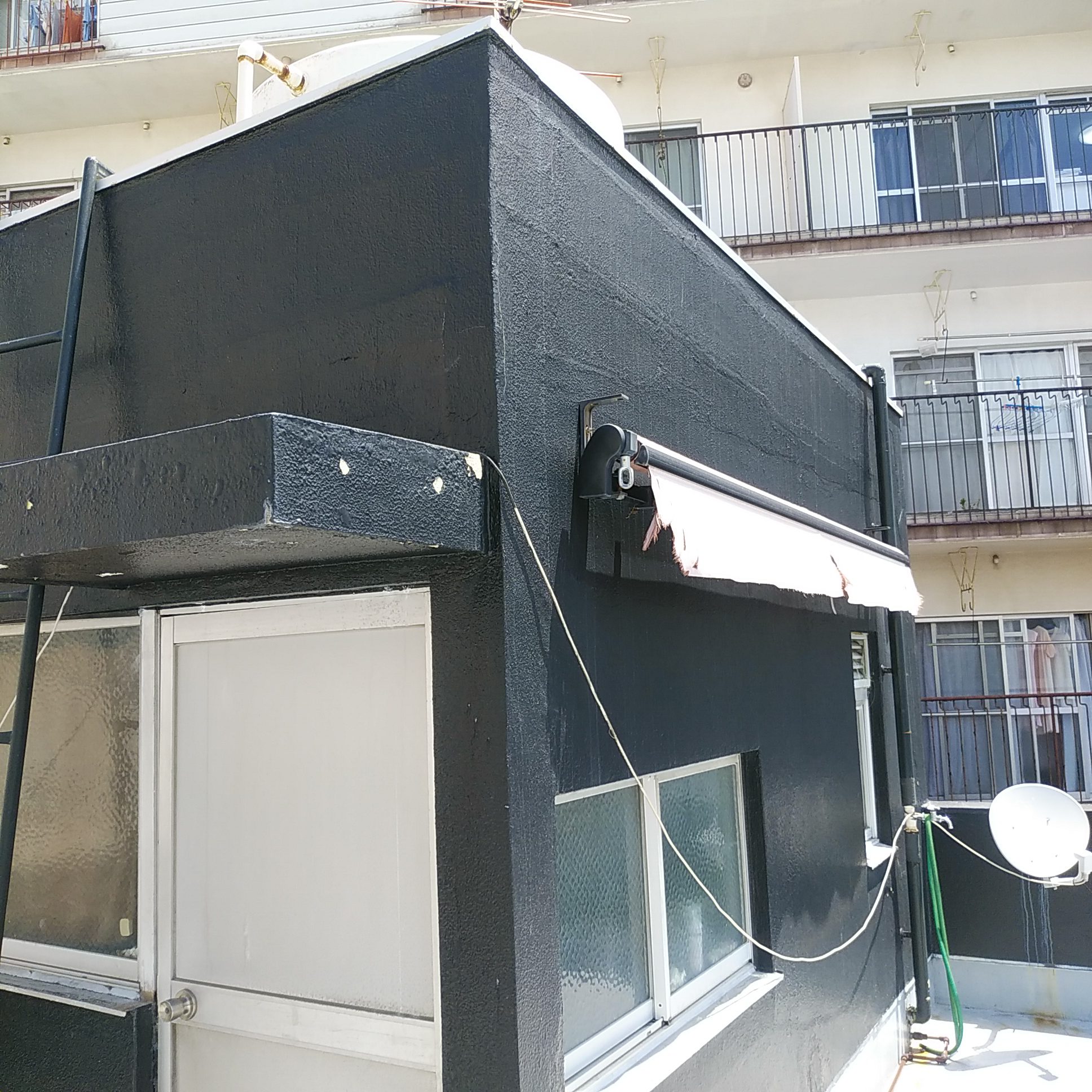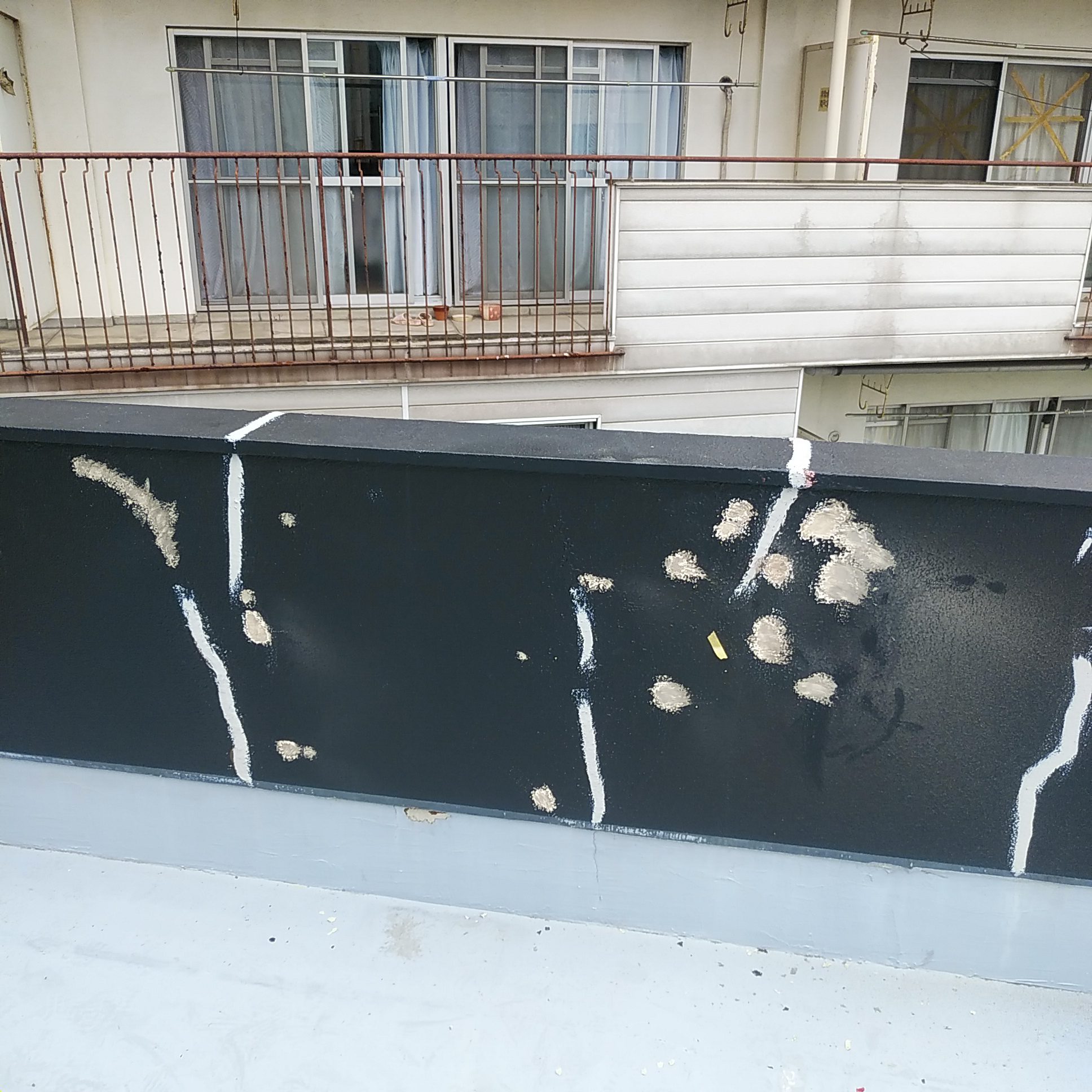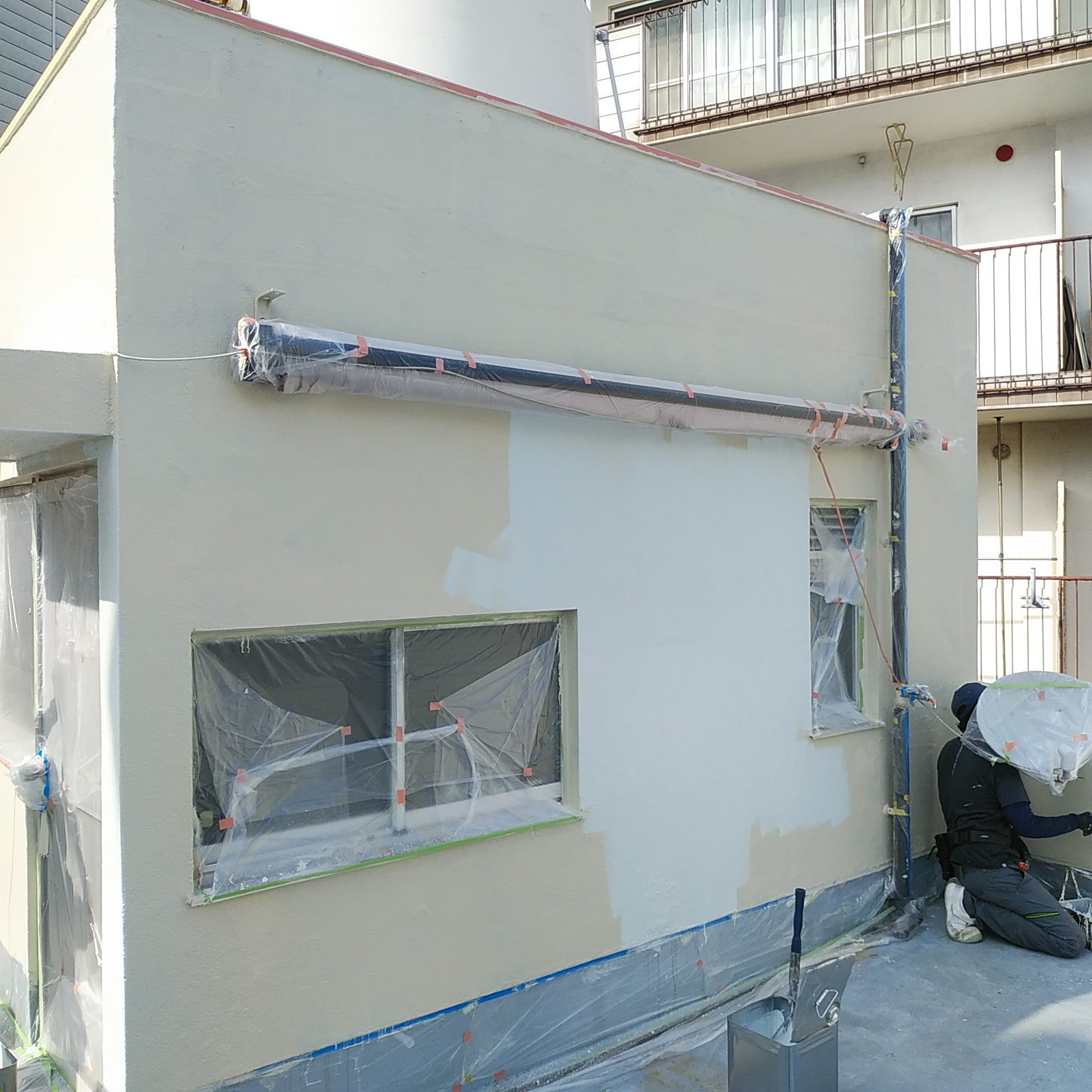 防水工事の前に壁面から行います。今回は色も変更することにしました。